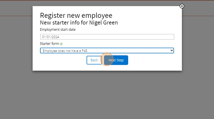 6 Provide the employee start date and indicate whether the employee is coming from a previous job or not by selecting if a P45 is available. In this example we do not have a P45. Click "Next Step"