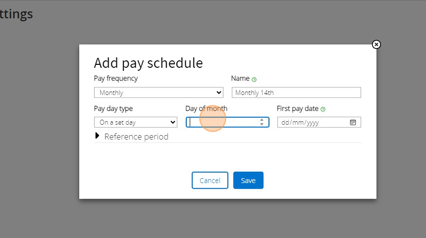 5 Click on the pay day type to provide us with the date your employees are paid. If you choose the "Day of month" option you can then provide more information on the day