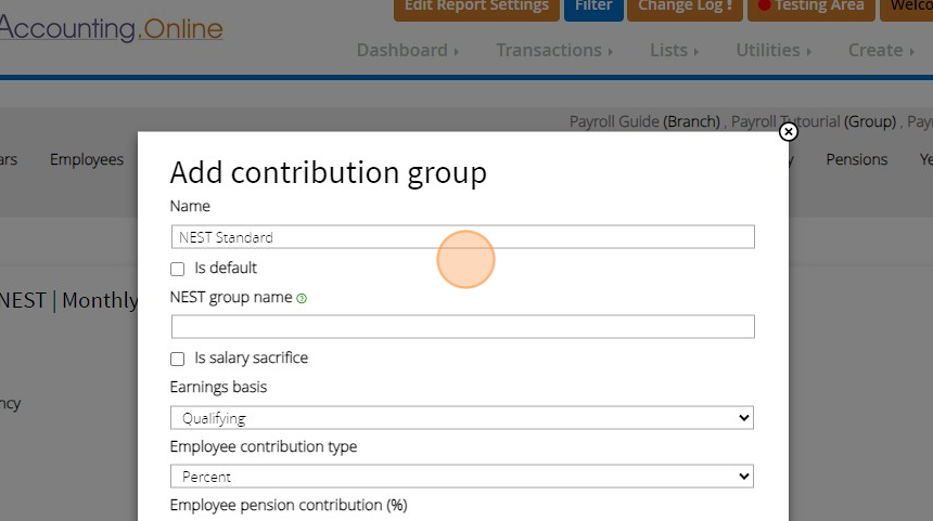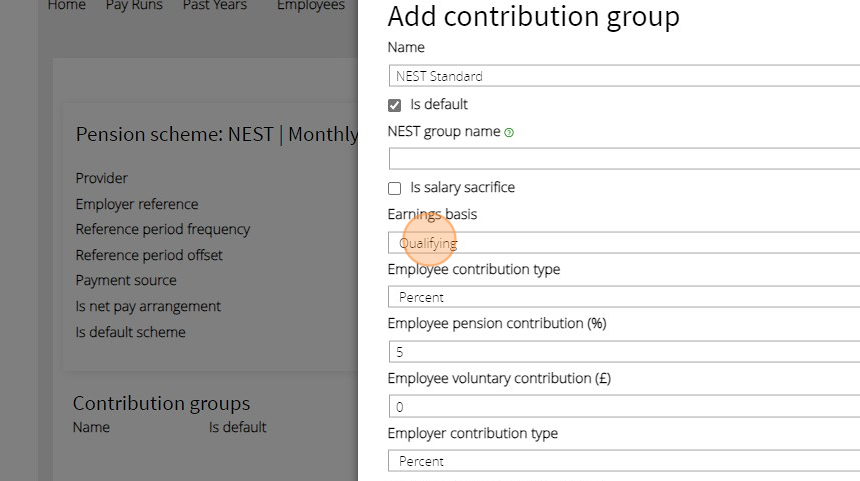 0 Once you have put in the details of the pension provider you can provide the details needed to calculate the pension on payslips. Click "Add Contribution Group"