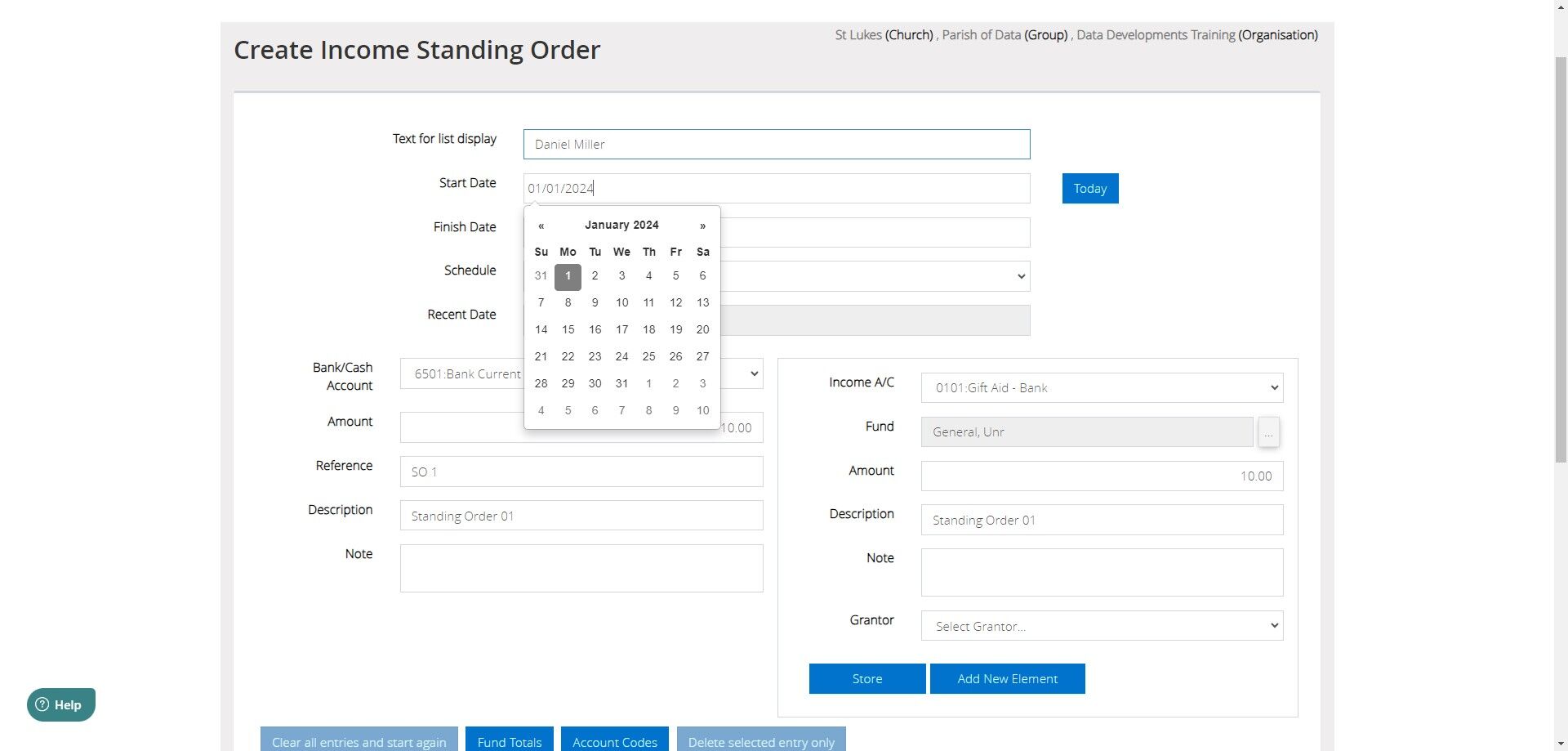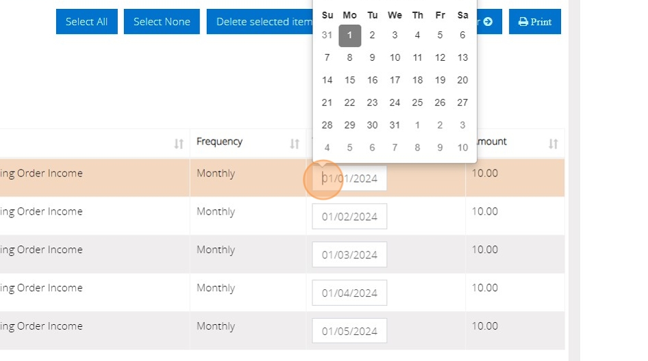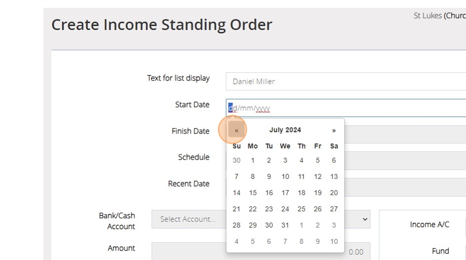 5. You will then need to enter the Start Date of the transaction. This is the date that the standing order will begin generating from. You are able to backdate this if you need to enter multiple months worth of transactions.