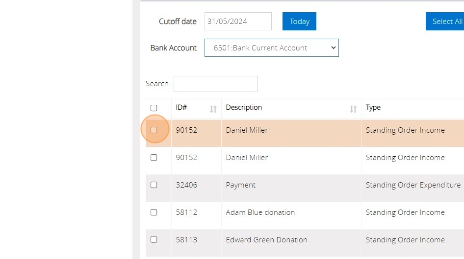 25. If you wish to select a standing order to be posted, you can click the checkbox shown below to the left of the transaction.