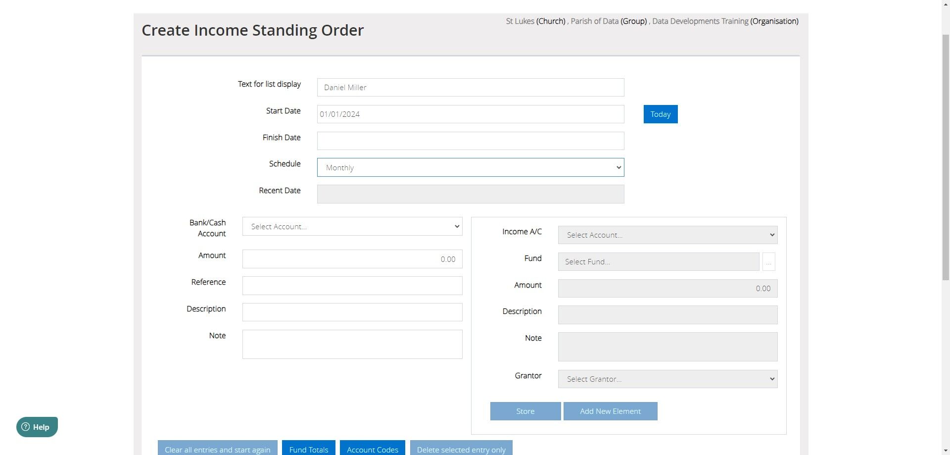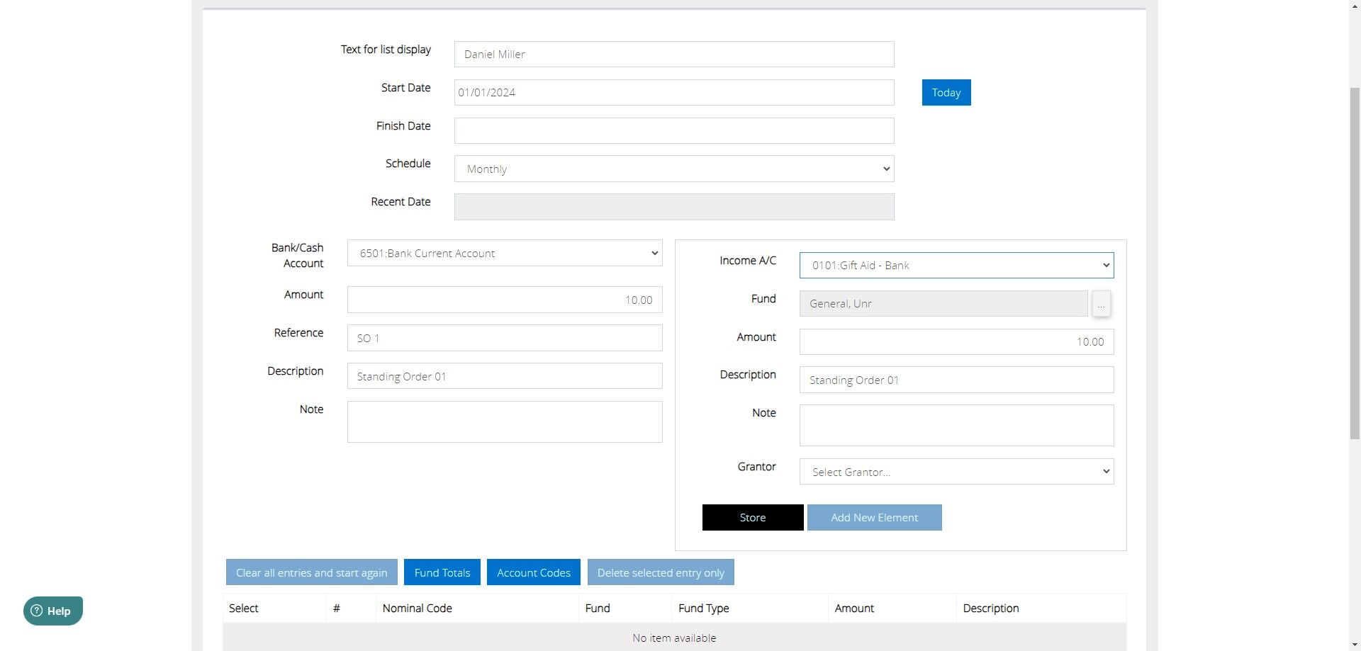 4. On the Create Income Standing Order screen, you will be able to enter in a 'text for list display'. This is a name that you will be able to see in the display of your standing orders, but will not be posted to the actual transaction itself. If you wish to keep donor's names private in your transaction listings, you can put their name here instead and use a more generic description and reference on the actual transaction.