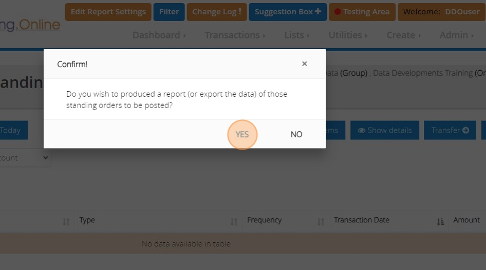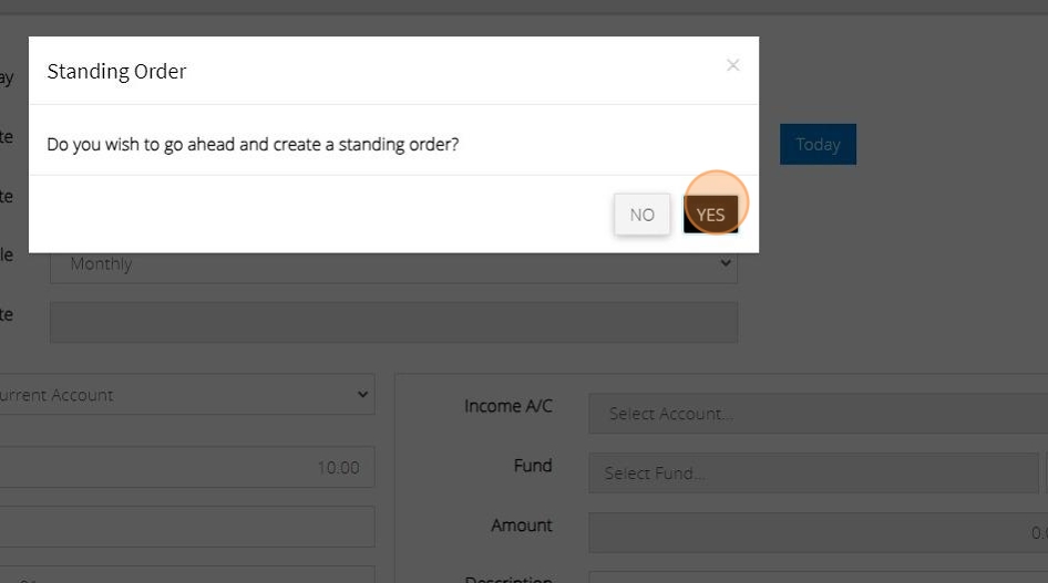 13. If both sides of the transaction balance, you will see a message that asks if you wish to go ahead and create a standing order. Click 'YES'