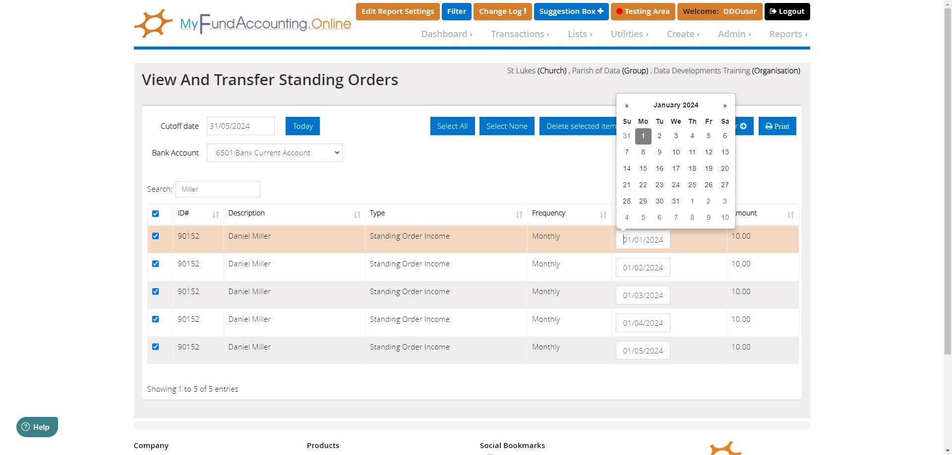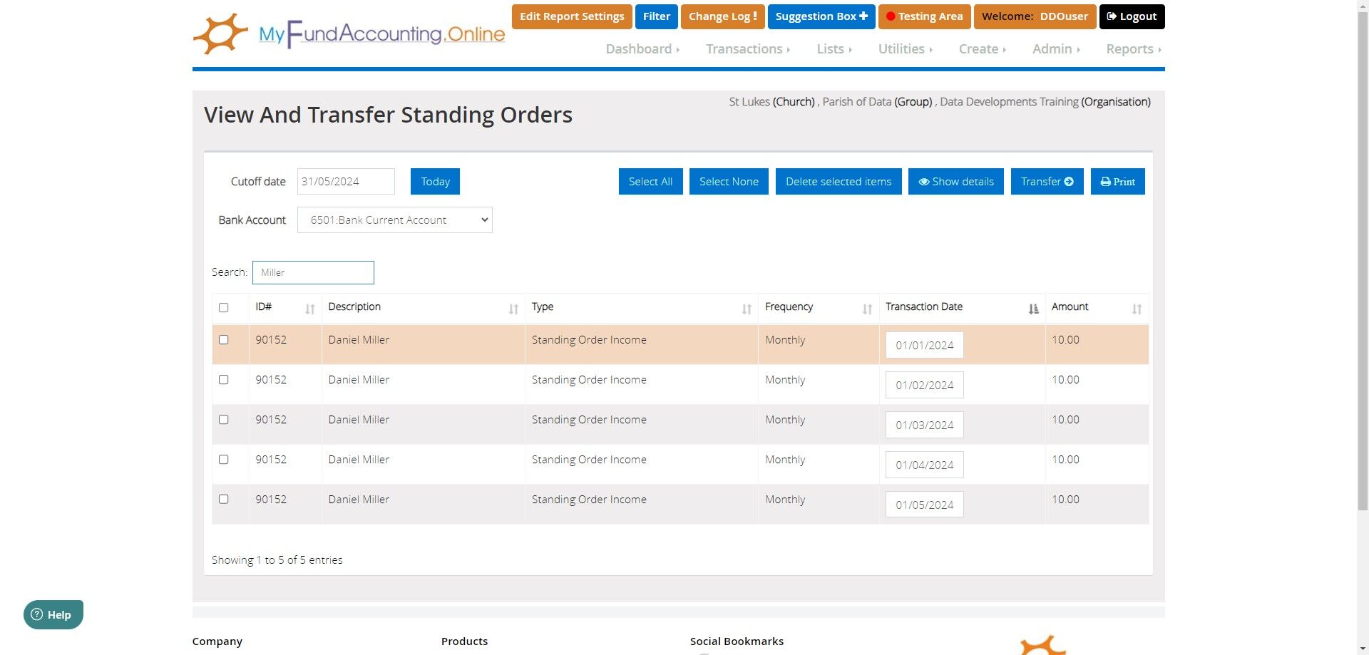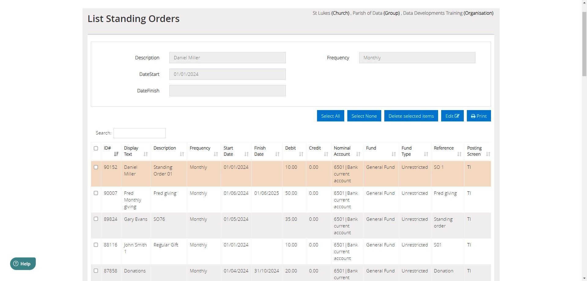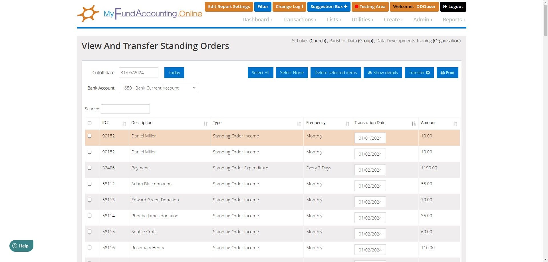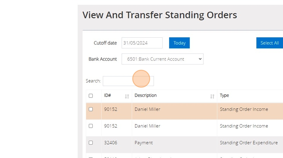 Tip: Standing orders do not automatically post to your transaction listings. They generate on the Process Standing Orders screen, ready for you to select which of them are to be posted to list transactions.
