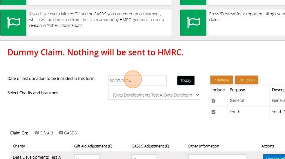 Tip: In certain situations, you may need to carry out a Dummy Claim to record donations as claimed without reporting this information to HMRC.