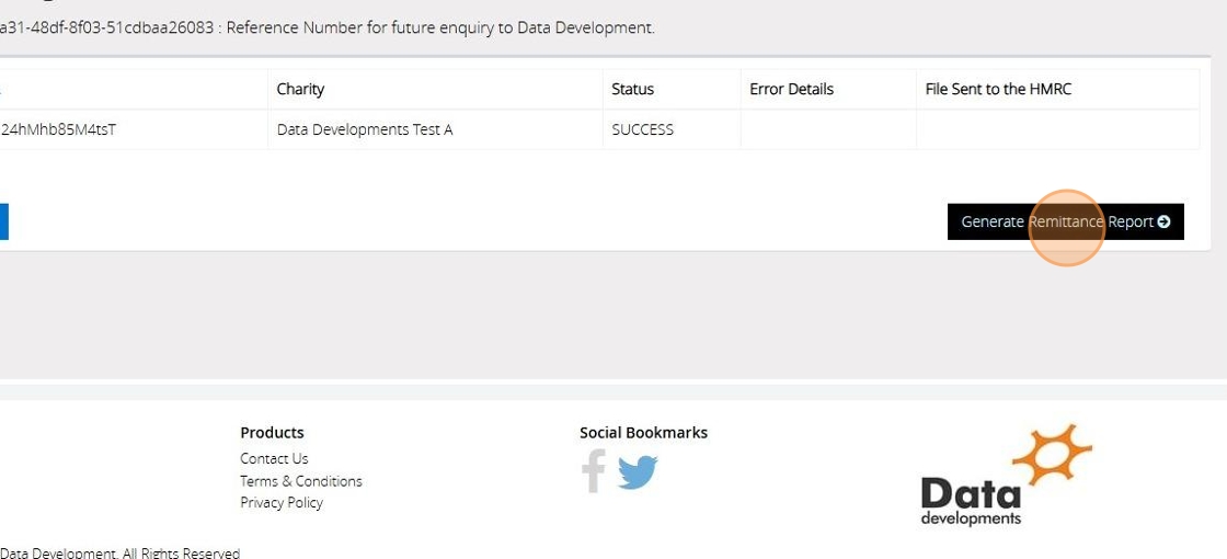 9. You will receive a message to show if your dummy claim has been run successfully. Click "Generate Remittance Report" to generate a report of the donations that have been marked as claimed.