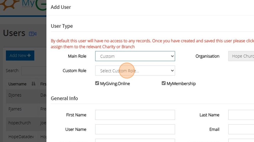 15. If you select to use a "Custom" role you will see a new dropdown where the roles you have created will appear. Click this dropdown to select the relevant role you wish to assign the user.