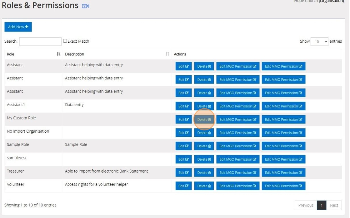 Alert! If the role has been assigned to a user it cannot be removed until the user is reassigned to another role or deleted