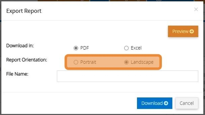4. You can choose to have the report in portrait or landscape mode. Depending on the report this may be set to landscape or portrait. You can change this, however, it may result in a report that doesn't look right.