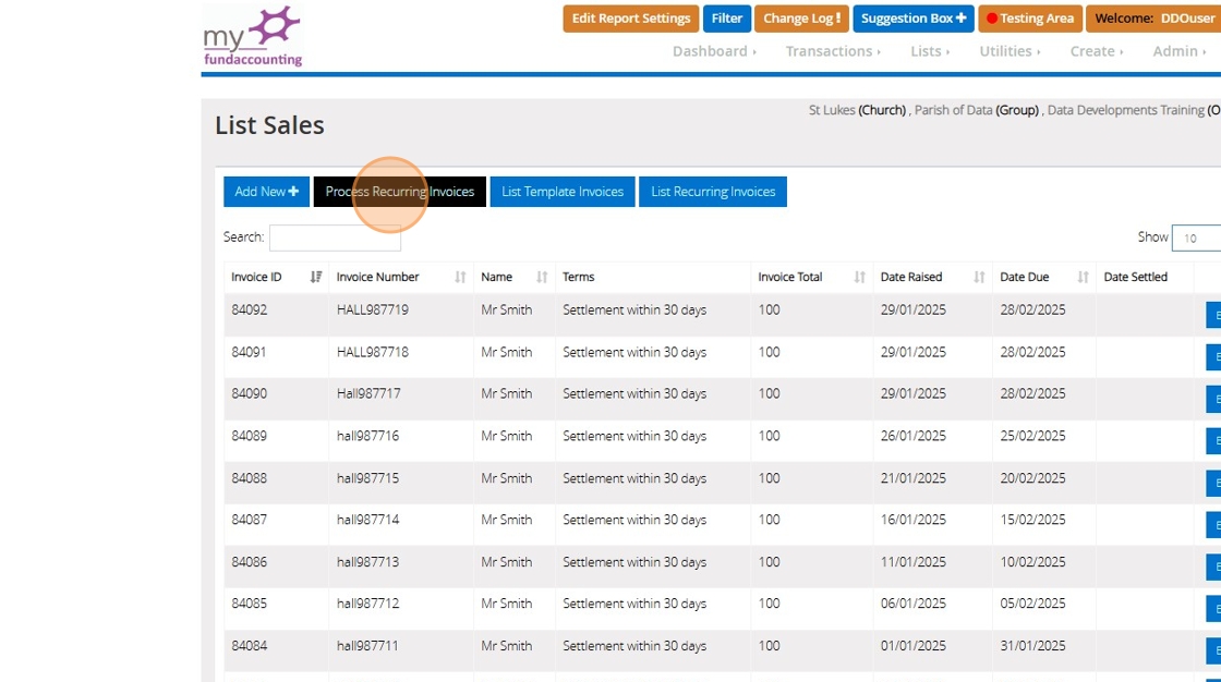 22. To process your recurring invoice, on the List Sales screen click "Process Recurring Invoices"