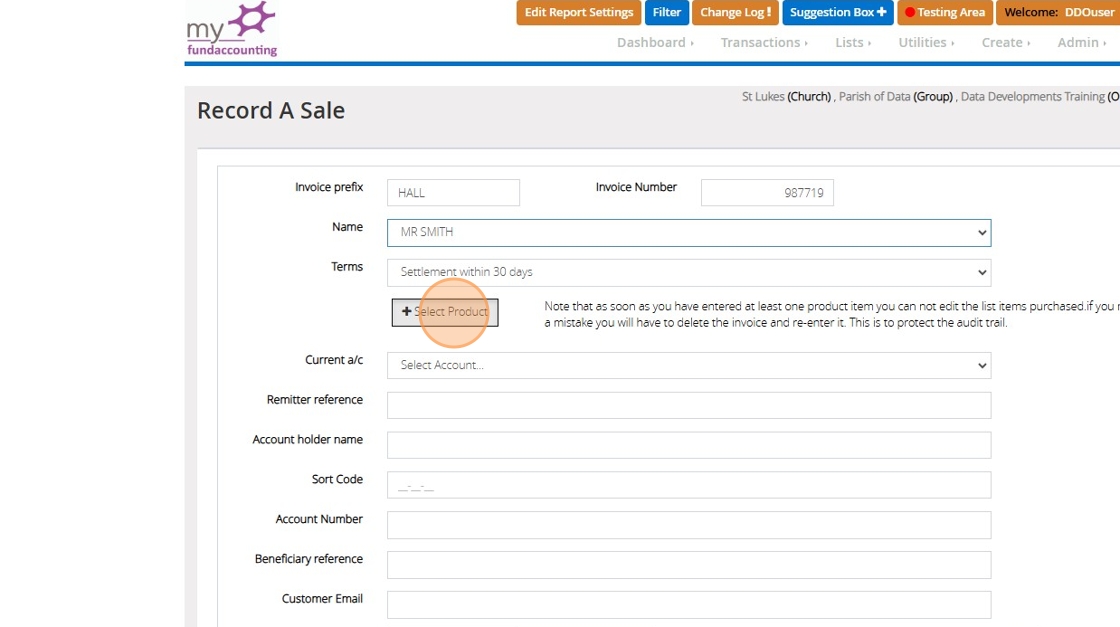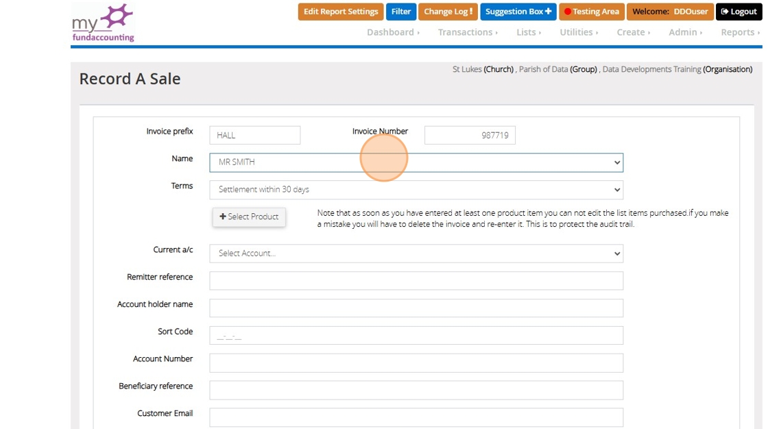 7. Fill in the invoice prefix, number and customer name for the invoice.