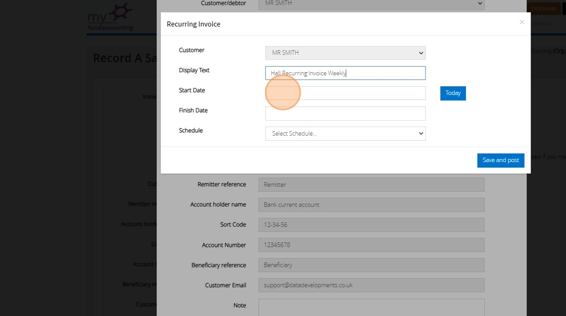 17. Enter the date from which you would like this invoice to begin generating from in the 'Start Date' box. You can also fill in the 'Finish Date' if the invoice is only going to be generating for a short date range.