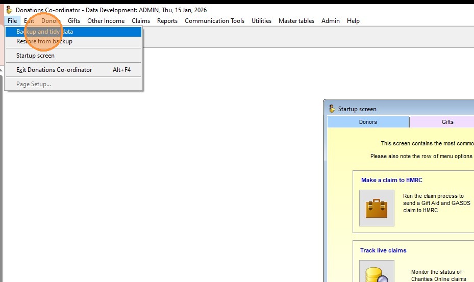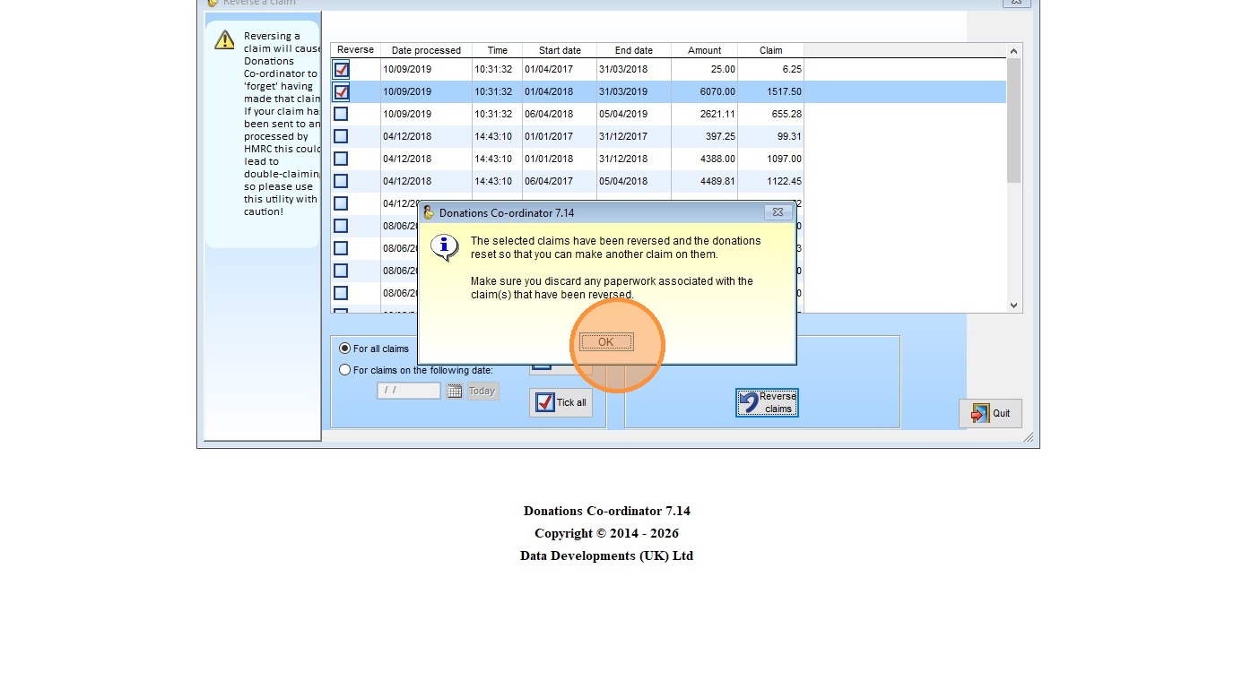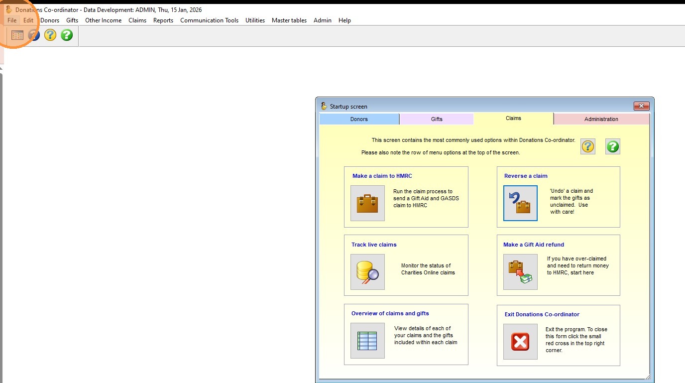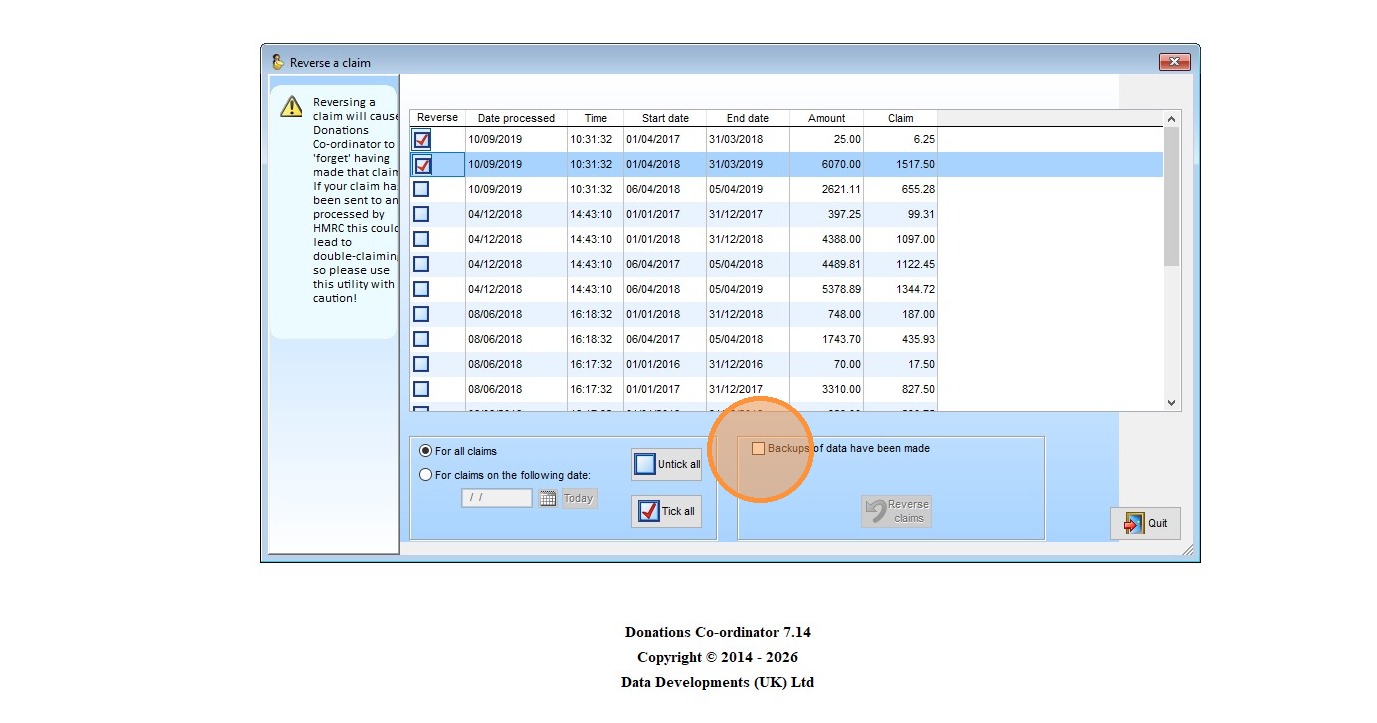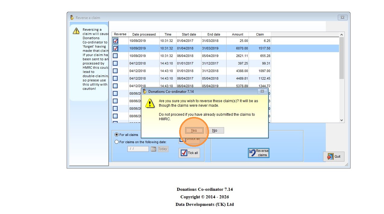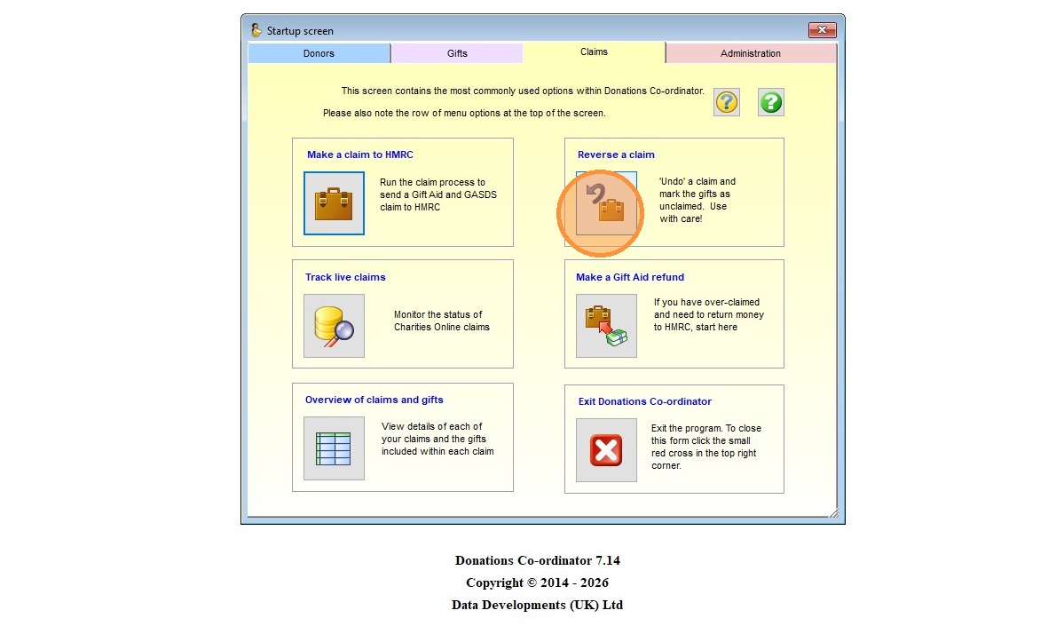 Before reversing your claim, first of all make sure that you have a backup file of your donations co-ordinator data.