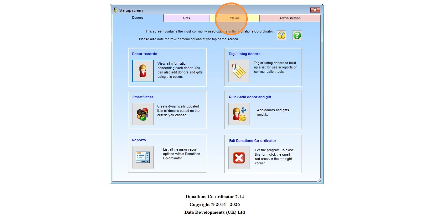 4. After you have made the backup file, the process will take you back to the Startup screen. From here, click on the 'Claims' tab.